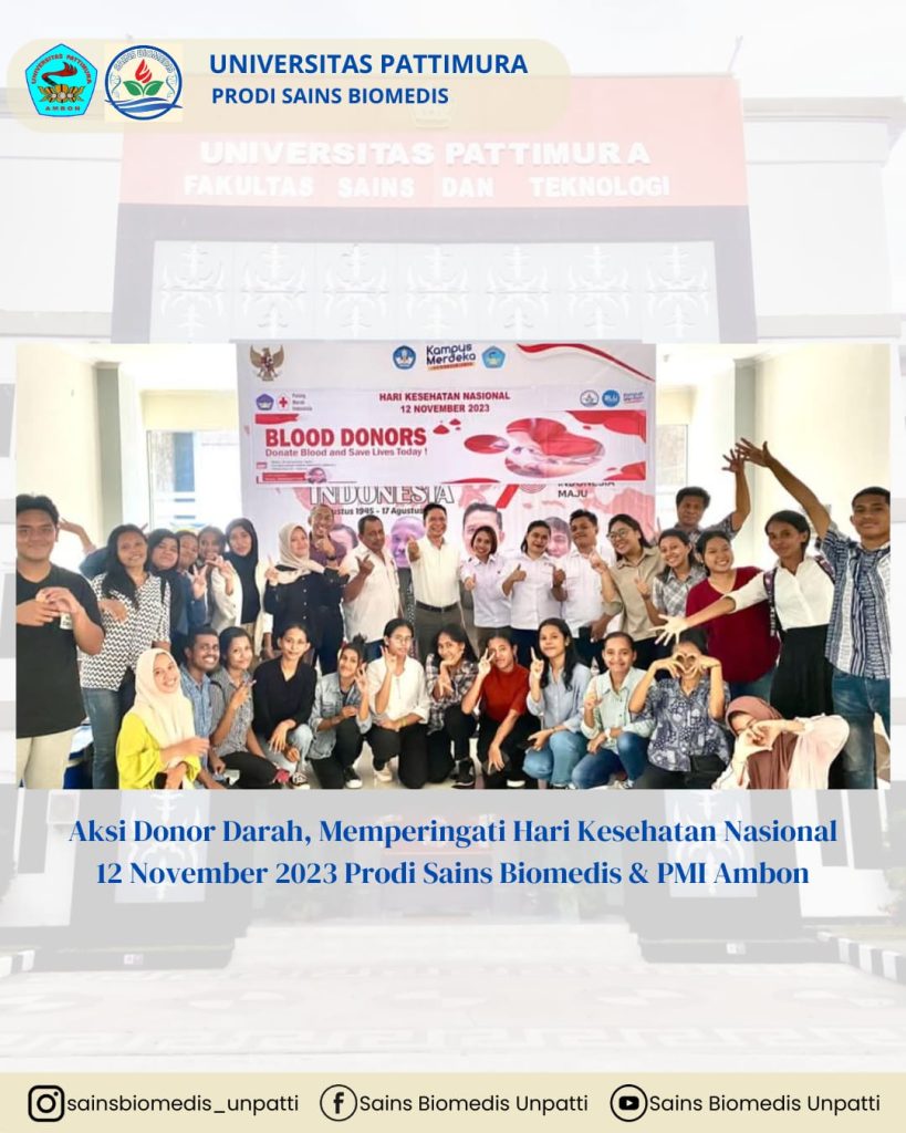 Rabu, 15 November 2023 – Program Studi Sains Biomedis menyelenggarakan kegiatan Aksi Donor Darah di Fakultas MIPA Universitas Pattimura dalam rangka memperingati Hari Kesehatan Nasional yang diperingati setiap tanggal 12 November.
