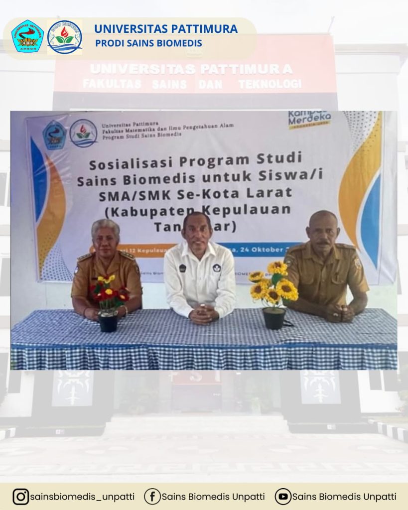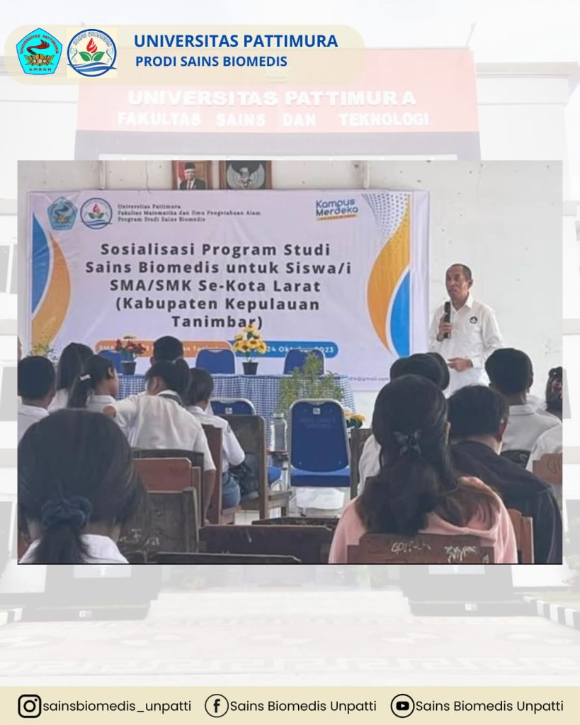 Selasa, 24 Oktober 2023, telah dilaksanakan kegiatan sosialisasi Program Studi Sains Biomedis di Kota Larat, Kepulauan Tanimbar. Kegiatan ini bertujuan untuk memperkenalkan Program Studi Sains Biomedis kepada masyarakat serta para calon mahasiswa, sekaligus memberikan gambaran mengenai prospek akademik dan peluang karier di bidang biomedis.
